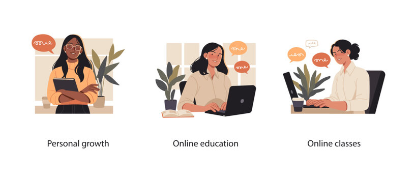Set of three illustrations depicting personal growth, online education, and online classes. Features diverse individuals engaged in learning, self-improvement, and digital education.