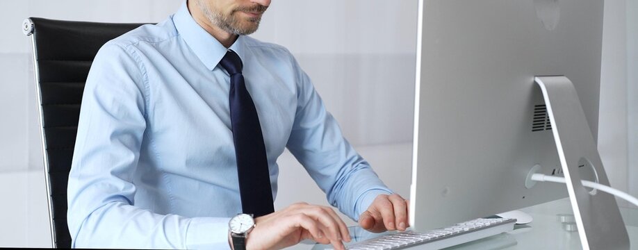 Mature businessman in office concentrating on important computer work, typing on keyboard, engaging in professional tasks, representing technology, development, and progress