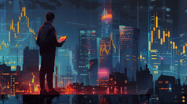The image shows investors engaging in activities related to technology, the stock market, gold, and graphs in graphic form.