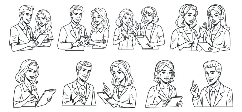 A collection of business professionals in line art vector style engaged in discussions and presentations, suitable for corporate branding and marketing materials