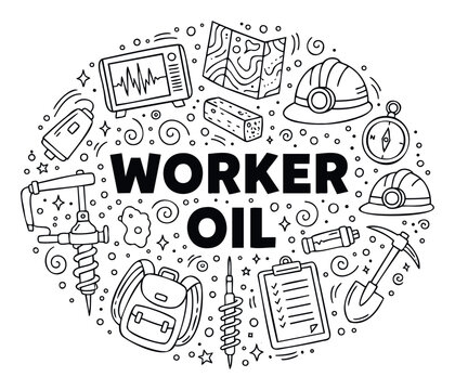 An engaging black and white circular doodle design showcasing essential tools and equipment for oil exploration, geology, and mining, perfect for industrial educational materials or energy