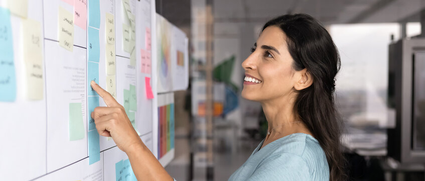 Young 30s Latina woman engaging in strategic and creative planning in modern office, focused as points to sticky note on large whiteboard or planning board filled with organized notes and documents