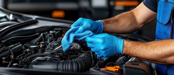 Man in blue gloves cleans car engine compartment with cloth. Person cares for car. Maintenance job in garage. Auto repair process. Focus on cleanliness, detail. Car mechanic works carefully. Engine