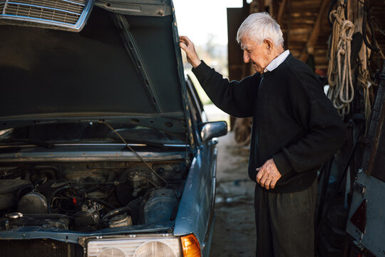 Elderly man inspects car engine in rural workshop