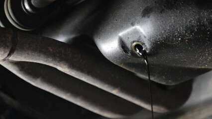 The hands of an auto mechanic unscrew the screw to drain the old engine oil under car. Replacing and draining old engine oil from the car. Car service and car care concept.