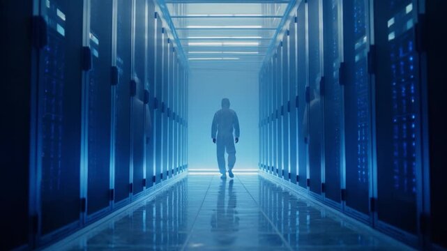 A young male engineer evaluates the efficiency of a cooling system in a data center corridor illuminated by blue LED lights.