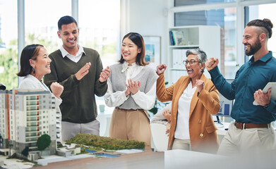 Close Up Of Group Of Asian Engineers Celebrating Finish Working At The Office