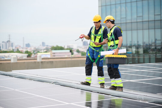 Engineers or workers is inspecting the solar panels on the rooftop with a city view