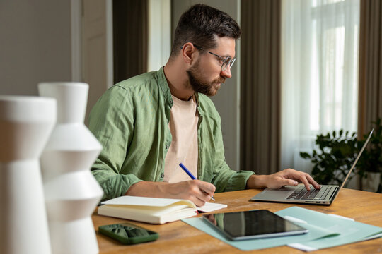 Bearded man reviewing notes on desk while working online with laptop and papers