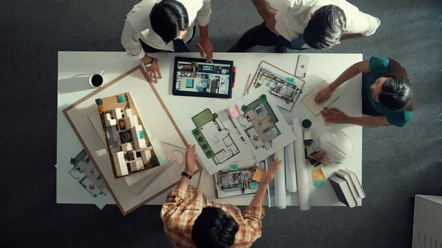 Top view of skilled architect engineer working together and shaking hand cooperative team while making contract and dealing. Aerial view of project manager talking and explain design. Alimentation.
