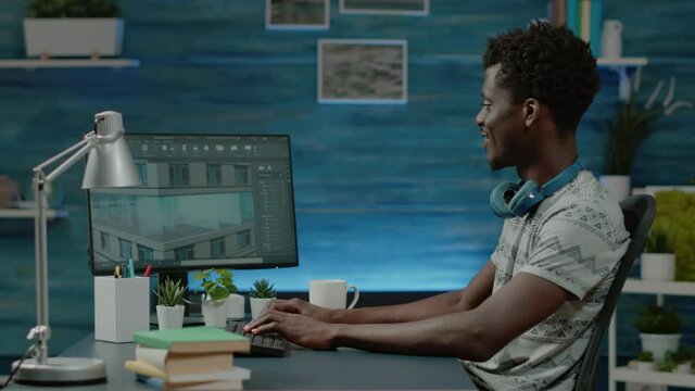 Architect working with building model on computer for construction plan and layout. Engineer designing blueprint project for architectural development. Skyscraper design on monitor