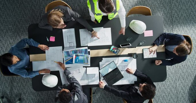 Top Down View of Diverse Team of Real Estate Construction Engineers Discussing Blueprints, Documents in a Corporate Office. Modern Workspace of Architectural Buro With Colleagues Using Tablet, Laptop.