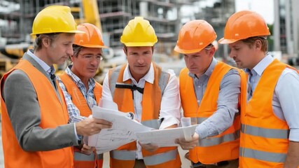 Construction Blueprint Analysis: A group of construction workers, wearing safety gear, meticulously examine architectural plans, the essence of teamwork and attention to detail.