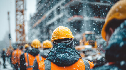 Workers in hard hats and safety vests closely watch the progress of a construction project in an urban environment on a cloudy day. The teamwork and focus are evident as they engage in their tasks