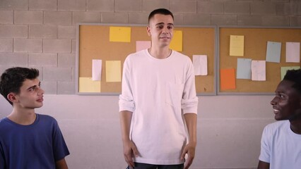 Confident college student presenting topic in front of group of multi-ethnic peers and professor seated in circle. University student giving a talk to the attendees of tutoring class.