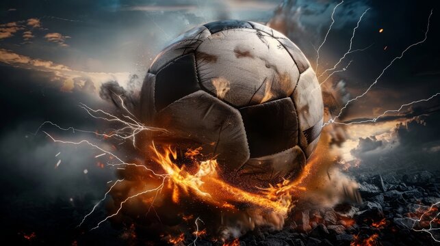 A soccer ball engulfed in flames and lightning streaking through the night sky against a backdrop of blue and orange