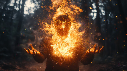 Enigmatic figure engulfed in flames amidst a dark forest displaying intense power and mystical aura fire manipulation concept