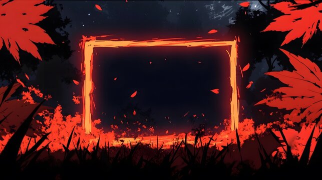 A vibrant, glowing rectangular frame amidst dark foliage and red leaves.