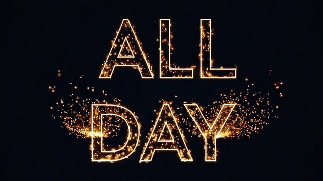 All Day word art on a dark background: The image presents the words ALL DAY in a captivating, fiery font style, surrounded by a glittering halo of sparks against a dark, enigmatic backdrop.