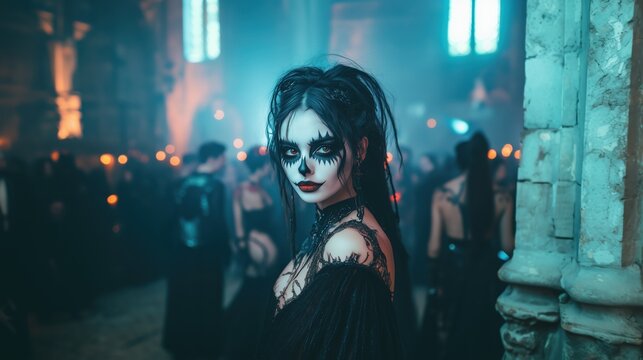 Woman in gothic makeup and costume at a mysterious party in a dimly lit ancient hall.