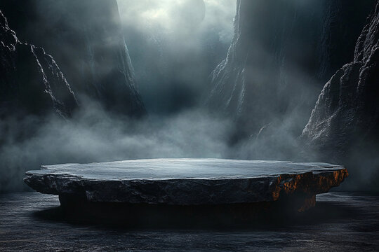 A sleek black podium surrounded by wispy, swirling mist against a dark backdrop. Background.