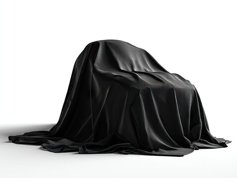 A black, draped cloth obscures a vehicle-sized object, hinting at a reveal or unveiling, casting a subtle shadow on a bright white background