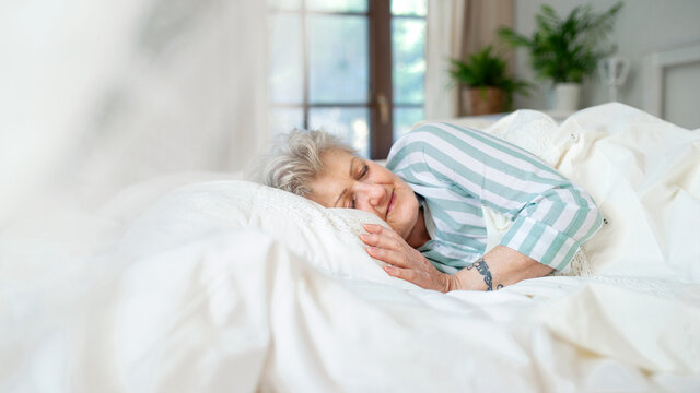 Peaceful young man sleeping in a comfortable bed alone at home, enjoying his orthopedic mattress and cozy pillow. Good sleep concept.