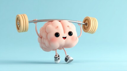 A smiling cartoon brain is engaged in lifting a dumbbell during his enjoyable workout