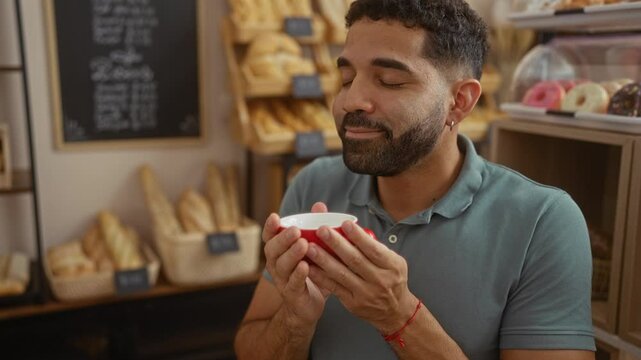 Young man enjoying a warm drink in a cozy bakery, surrounded by freshly baked bread and pastries