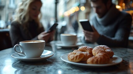 A couple uses their phones while enjoying coffee and pastries