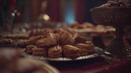 enjoying a festive spread of traditional moroccan pastries including almond cookies at a vibrant cultural gathering with friends and family