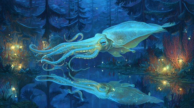 Giant Squid Swimming in Dark Ocean with Bioluminescent Lights