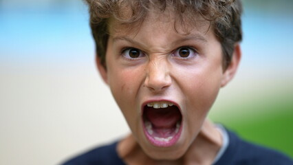 One angry young boy screaming to camera. Preteen child open mouth yelling in anger. Furious enraged male kid screaming