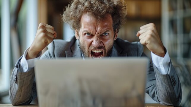 An enraged businessman sits behind his laptop