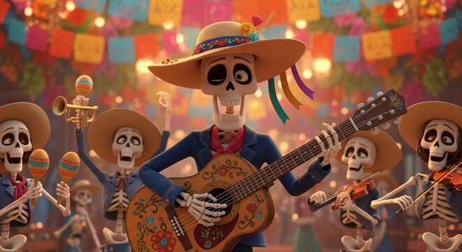 Festive day of the dead celebration with musical skeleton band in a lively atmosphere