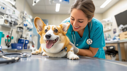 A veterinarian attends to a cheerful corgi in a well-equipped clinic, ensuring the dog feels comfortable and cared for during a routine examination by smiling at it