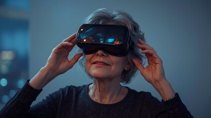 An elderly woman wearing virtual reality glasses, immersed in a digital world, demonstrates the combination of technology and age, highlighting how virtual reality can engage and entertain people
