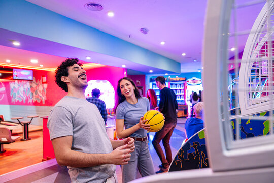 Young adults having fun playing arcade basketball game in entertainment center with neon lights
