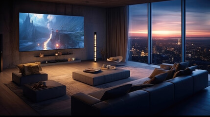 Modern Living Room: A sleek and stylish living room with a minimalist aesthetic, featuring a black wall with a large TV, a wooden entertainment center, and a comfortable brown sofa.