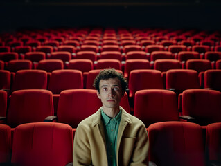 Generative AI illustration of young man sitting in a movie theater watching a movie