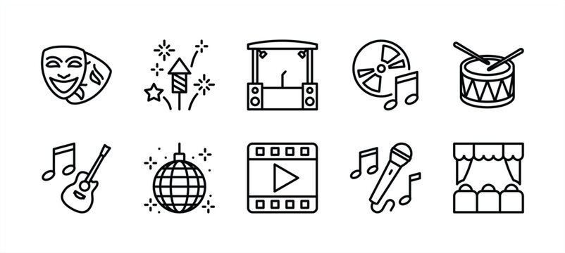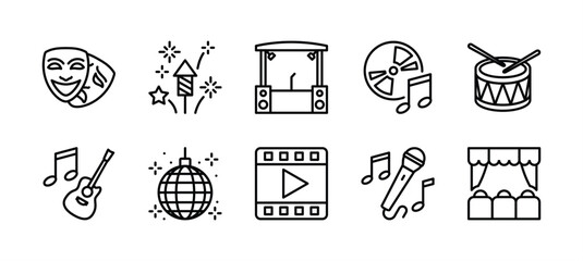Event entertainment thin line icon set. Containing theatre mask, fireworks, stage, concert music, drum, acoustic guitar, disco ball, karaoke, singing, cinema movie video. Vector illustration