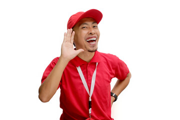 Special promotion. Young asian woman shouting to announce information on white background, space for text
