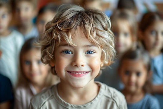 Boy in kindergarten, enthusiastic learner participating in educational play with peers.