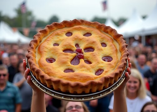 The annual Turkey Day festival features a massive pie held aloft by a crowd of enthusiastic participants for the county fair.