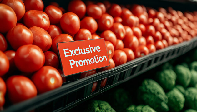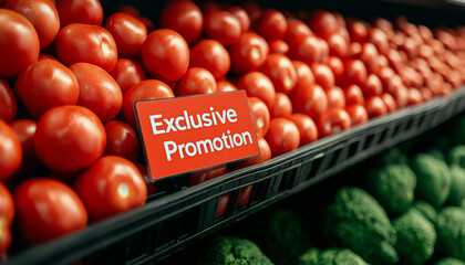 Fresh tomatoes on display with exclusive promotion sign, inviting customers to enjoy great deal on quality produce