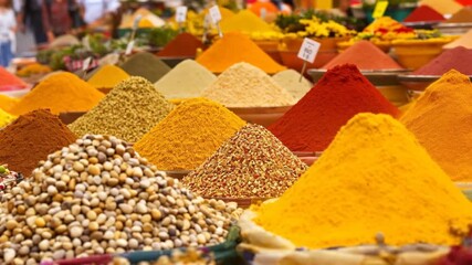 Colorful yarn balls are displayed on a market stall table, creating a vibrant and enticing scene that captures the essence of a bustling marketplace with shoppers and vendors in the background