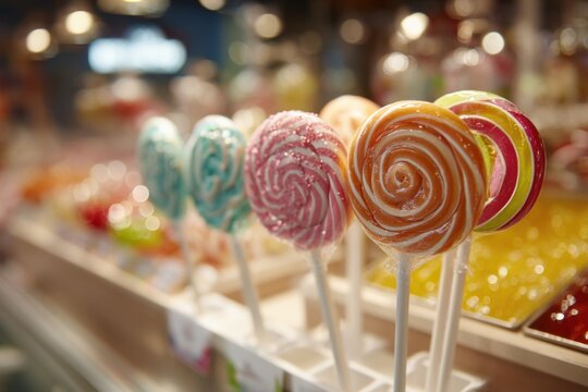 Brightly colored lollipops sit in a candy shop, enticing shoppers with their swirls and sugary appeal on a lively afternoon