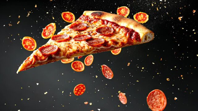 Delicious slice of pepperoni pizza soaring on a black background, an enticing design, Ai Generated.