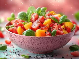 Vibrant salad bowl featuring fresh vegetables, inviting presentation, appealing colors, enticing culinary display