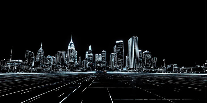 Abstract Wireframe City Skyline Black Background White Lines Digital Representation A stylized representation of a city skyline rendered entirely in